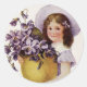 Esta imagen vintage está cortada de una carta de bienvenida más grande de la época victoriana. Un joven chica de pelo oscuro sostiene un gran tazón lleno de violetas. Tiene una flor violeta en el pelo y su gorra y su vestido son de color violeta pálido o lavanda.