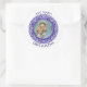 Hermosa pegatina de la Virgen Inmaculada María con el Niño Jesús. Un borde decorativo azul rodea la imagen. El texto puede ser personalizado.