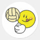 Sonrisa suave frente al diseño deportivo de los jugadores de voleibol.