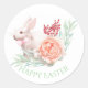 Soft watercolor painting of an Easter bunny and flowers on "Happy Easter" stickers.