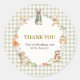 Add a heartfelt touch to your baby shower favors with this charming thank you sticker! A sweet watercolor wreath frames a classic bunny at the center, surrounded by playful woodland friends—mice with bows, cuddly teddy bear, clever fox, hedgehog, rocking bunny, and wise owl—amid soft florals, leaves, berries, butterflies, and a timeless light green gingham background. Perfect for sealing party bags, thank you notes, or adding extra cuteness to your rustic forest or spring celebration. Adorable, vintage-inspired, and fully customizable for a memorable "little bunny" baby shower!