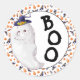 Pegatina de Halloween lindo con un fantasma sonriente en un gorra de brujas con la palabra "Boo". El diseño redondeado está enmarcado con un divertido borde de calabazas, murciélagos y hojas de otoño en naranja festivo y morado. Perfecto para sellar bolsos de fiesta, tratamientos en el aula, o agregar un divertido toque estacional a los regalos y artesanías.