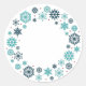 Un diseño festivo para la temporada de vacaciones con una corona redonda de copos de nieve azules sobre fondo blanco.