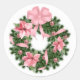Una corona de pino rosado, adornos rosas y un arco rosado.