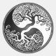 Este estilizado yin yang blanco y negro presenta un árbol retorcido que crece desde el centro del diseño. Las ramas intrincadas que se extienden a la parte superior del patrón son una imagen reflejada de las raíces que cuelgan debajo. Este diseño único es un símbolo elegante para el equilibrio de la naturaleza.