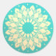 Plantilla de Pegatina del Instructor de Meditación de YOGA Studio - Elegantes símbolos de Mandala floral de Relieve metalizado dorado falso sobre fondo verde Verde azulado y azul turquesa.