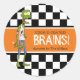 A los niños les encantarán estos horripilantes pegatinas de Halloween y creerán que es gracioso que donaras tu cerebro para hacerlos. El diseño incluye un zombi con un solo arma y el texto 'Cerebros con cubierta de gallina donados por los molineros' (cambia este texto a su propio texto preferido). El fondo es un patrón de tablero de ajedrez en blanco y negro. Busque ID213 para ver otros productos con este diseño.