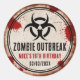 Vintage look round sticker for a zombie survival themed party, with a weathered sign.