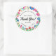 Inspirado por el colorido bordado de artesanos nativos mexicanos, este pegatina redondo personalizado es el toque final perfecto para sobres, favores y bolsos de bienvenida. Ideal para una boda de destino o simplemente para una fiesta de temática mexicana, su texto personalizado está enmarcado por un anillo de flores y follaje de colores vivos.
