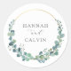 Selle sus sobres de invitación o favores con estos clásicos stickers botánicos de boda. Con sus nombres enmarcados por una corona acuarela de eucalipto verde. Coordenadas con la colección boda Eucalyptus encontradas en la tienda de papel Adore Co. Zazzle.