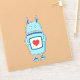 Pegatina lindo del robot con un ilustracion del dibujo animado de un robot torpe azul del dibujo animado que sostiene una placa con un corazón. Las piernas del robot se hacen de Yellow Springs brillante, sus ojos están alrededor - uno grande, uno pequeño, y él tiene una mirada desconcertada en su cara. Este diseño del robot tiene colores brillantes, alegres. Es conveniente para los frikis que aman los robots y los ilustraciones lindos.