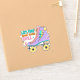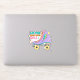 Colorido pegatina de contorno de computadora portátil retro de los años 90 con un diseño de neón morado, verde azulado, amarillo, naranja y rosa de una patineta rodante con un relámpago y un texto, "Que los buenos tiempos roten".