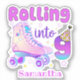 Este diseño lindo y morado incluye la frase "Rolling Into 9". Es perfecto para la celebración de cumpleaños de un patinador de ruedas.