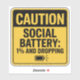 Un audaz e ingenioso pegatina de signos de cautela para cada alma socialmente drenada. Con una barra negra en la parte superior gritando "PRECAUCIÓN" en amarillo, y una mitad amarilla inferior declarando "BATERÍA SOCIAL: 1% Y DROPEANDO" en negrita, este diseño captura la lucha introvertida con encanto e impacto. Un icono de batería minimalista con un símbolo de advertencia intermitente añade el perfecto golpe visual. Las líneas depuradas, el alto contraste y una estética de estilo oficial hacen de esto un pegatina relacional y divertido para botellas de agua, laptops, revistas o cualquier lugar que necesite un poco de comentarios sociales.