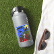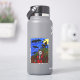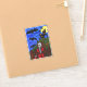 Esta calcomanía de vinilo tiene un esqueleto de segador con una capa roja con capucha parado junto a una cerca de madera frente a una silueta negra de una casa embrujada y un cementerio con murciélagos volando sobre ella bajo una gran luna amarilla.