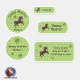 Hübsche wasserfeste Namensaufkleber für Mädchen. Set mit 24 verschiedenen eckigen und runden Namensaufklebern, Motiv Pony und Schmetterlinge auf grünen Sternchen-Hintergrund.
