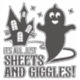 A cheeky Halloween graphic featuring a smiling ghost, crooked haunted house, and the pun-filled phrase “It’s all just sheets and giggles.” Surrounded by stars and spooky charm, this monochrome design blends humor with haunted whimsy—perfect for festive collections, lighthearted themes, and playful takes on October’s ghostly delights.