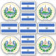 Cuatro pegatinas de vinilo cortados por Personalizados con el escudo de armas de El Salvador y siete pegatinas con la bandera salvadoreña en el centro