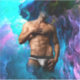 SlipperyJoe hombre musculoso ropa interior abultado vibrante tonos azul verde azulado púrpura abstracción de orgullo gay regalos LGBTQIA artístico soñar energía abstracta surrealismo psicodélico efecto cósmico surrealista e imaginativo la mano de fondo descansa sobre el pecho