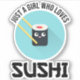 Sólo Un Chica Que Ama El Sushi. Este gracioso y lindo accesorio de amante del sushi es un gran regalo para mujeres, chicas, adolescentes y niños que aman comer sushi y sashimi en los restaurantes japoneses, y les encanta el wasabi, el jengibre y la salsa de soja. Si te gusta la comida japonesa, y comes rollos de maki de atún y sushi de nigiri con arroz vinagre, entonces este lindo diseño de sushi kawaii es para ti! Presenta un gráfico de palillos sosteniendo un pequeño rollo de sushi personalizado con una cara feliz.