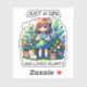 Pegatinas amables para cualquier chica que ame las plantas. Gráfica ai personalizada en un estilo de videojuego de píxeles. Chica con una lata de agua rodeada de muchas plantas.