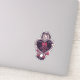 This vinyl sticker is a spooky rag doll with black yarn looking hair, pale face in a red dress holding a big black heart with white lace trim and a red bow.