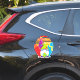 Adorable lindo surfista gnome pegatina. gnomo con barba en sus gafas de sol y pantalones cortos de verano, delante de coloridas tablas de surf y puesta de sol.