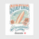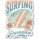 Surfing Paradise estilo retro diseño de texto con flores, pájaros, olas oceánicas y decoración de tablas de surf