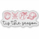 Este pegatina presenta un diseño temático de béisbol y softball de estilo rojo dibujado a mano. Incluye un guante, bates de béisbol cruzados con formas de corazón pequeñas a su alrededor, una pelota de béisbol con un arco atado a su alrededor y una gorra de béisbol con el texto "esta es la temporada". El diseño es sencillo pero de diseño y de diseño.
