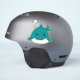 Tiburón azul y blanco personalizado con una hilera de dientes puntiagudos haciendo una sonrisa temible soplando tres burbujas que están flotando.