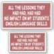 Todas las lecciones que habían aprendido no habían tenido ningún impacto en las habilidades de mis alumnos en inglés. Un divertido diseño de tipografía para un profesor de inglés. La palabra que se ha repetido cuatro veces en la sentencia, pero la sentencia sigue teniendo sentido. Esto refleja la dificultad de aprender el inglés.