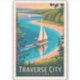 Diseño de viaje vectorial retro de la ciudad de travesía. Traverse City, Michigan, es un encantador destino junto al lago conocido como la Capital Mundial de las Cerezas, que ofrece a los visitantes viñedos, playas de arena del lago Michigan y paisajes pintorescos.