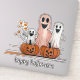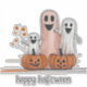 Este es un lindo pegatina de Halloween que presenta tres fantasmas felices y dos Faroles Jack o'. Puede personalizar el texto predeterminado "Halloween feliz".