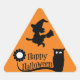 En este pegatina triangular se muestra una imagen corta y con dibujos de una bruja en su escoba y un búho en una rama con deseos de 'Halloween feliz'. ¡Ideal para enviar por correo esa tarjeta especial de Halloween, un libro de recortes, decoración o truco o regalo!