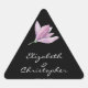 Pegatinas triangulares personalizados con una hermosa acuarela de flores de magnolia morada y tu texto con letras blancas de moda sobre un fondo negro, perfecto para favores de boda, ducha de novia, sellos para invitados a la boda y más. Disponible en diferentes formas. ELEMENTOS COINCIDENTES EN nuestra tienda.