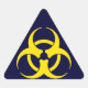 Pegatina del triángulo azul oscuro con un símbolo de advertencia de riesgo biológico amarillo brillante.