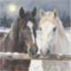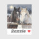 Sticker with an illustration of two horses on a snowy winter ranch with a full moon in back of them standing behind an old rustic fence.
