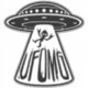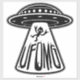 Ilustracion personalizado vectorial de un OVNI secuestrando a una persona que piensa que los extraterrestres rompen con el texto de la UFOMG. Etiquetas: OVNI, OMG, no identificado, volando, objeto, oh, Dios mío, espacio, nave espacial, alien, marciano, personalizado, diablo, cuernos, secuestro, cuarto, tipo, humor, platillo