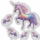 Un impresionante unicornio plateado se sostiene orgullosamente con brillantes luces de arco iris en todo su cuerpo. Este poderoso diseño combina fuerza, magia y majestuosidad. El conjunto de cinco pegatinas incluye un unicornio grande y dos pares de unicornios más pequeños. Ideal para quien ama el arte de fantasía con un toque dramático. Perfecto para adultos y adolescentes a los que les gusta la energía mágica y brillante.