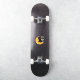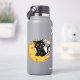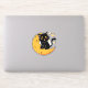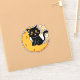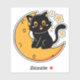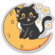 Ilustracion de un lindo y feliz gato negro sentado en la luna amarilla con estrellas en el fondo