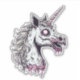 The unicorn's eyes are hollow and lifeless, yet one of them glows with an unsettling, supernatural light. The once-pristine horn is now cracked and jagged, symbolizing its descent into zombification. Pink blood oozes from wounds and drips from its mouth, adding a surreal yet striking contrast to the otherwise grim visage.this design merges whimsy with the macabre. It's perfect for fans who appreciate a bold and unconventional take on mythical creatures, combining the enchanting allure of unicorns with the chilling intrigue of zombies.