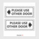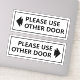 ¿Buscando una manera de dirigir educadamente el tráfico de pies en su negocio? No busque más allá de este signo blanco de "Por favor use Other Door" con un juego de pegatina de vinilo con flecha. Estos versátiles pegatinas se pueden colocar en cualquier puerta o ventana y seguro que transmitirán su mensaje sin ninguna confusión. El texto negro claro y la flecha son fáciles de ver, incluso desde una distancia. Los mensajes de este conjunto de pegatinas se pueden personalizar.