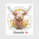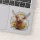 bonito linda vaca de tierras altas, corona de flores de girasol amarilla, girasoles en la cabeza de cuernos, flores y cuernos de toro, ilustracion de pintura artística acuarela, hermoso rancho de ganado escocés, campo de prado natural silvestre, ambiente de primavera de granja de verano, agricultor de vaqueros, adorable dulce brillante florido