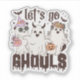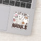 Diseño de Halloween lindo e ingenioso en camisetas, tazas, bolsas, almohadas, botones y más incluye tres graciosos demonios de Halloween con cuernos del diablo y gorras de brujas, murciélagos, flores, calabaza de linternas y texto que dice ¡Vamos Ghouls!