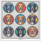 Una vibrante colección de ilustraciones de estilo vitral que muestra múltiples razas de perros, cada una presentada como retratos únicos dentro de marcos circulares, resaltando el detalle artístico y el encanto decorativo.
