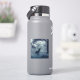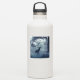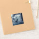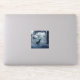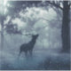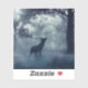 Pegatina de tortuga con una foto de un venado majestuoso con cuerdas paradas en un bosque oscuro entre árboles iluminados por el sol. Nieve por todas partes.