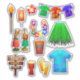 Una colección de pegatinas tropicales de verano con temática hawaiin luau. Incluyendo antorcha de tiki, camisetas hawaianos, chanclas, hibiscus lei y más.
