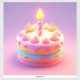 Pastel de cumpleaños decorado de forma vívida con una sola vela en la parte superior, rodeado de colores pastel vivos y detalles artísticos del congelador. El pastel transmite un ambiente alegre y un concepto de celebración.