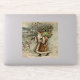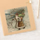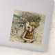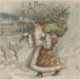 Vintage Santa Claus Carrying a Christmas Tree in the Snow - Since when does Santa actually bring a tree with him? This image is based on a vintage Christmas Card from the late 1800s. Back then, Santa didn't always wear red. In this Santa Claus illustration, St. Nick is wearing a warm brown suit, and his bag of goodies is green. Santa Claus is walking through the snow, with a Christmas tree on his back. The snowstorm looks cold! Early cards of vintage Santa showed Santa in brown, green and red suits in the late 1800s. This card says "A Merry Christmas" -- and even though our Santa is wearing a brown suit, after all, he deserves a bit of a wardrobe change now and then! He's carrying a bright new drum in his package. I wonder what else Santa has in his toy bag?