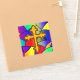 Una cruz y pegatinas religiosos con vidrios manchados.